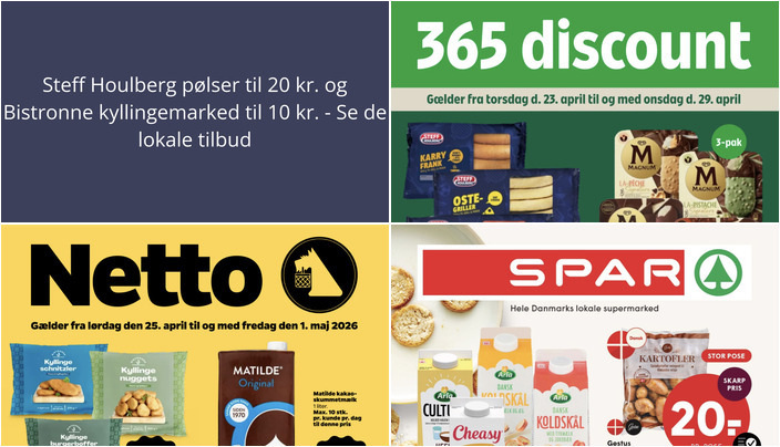 Coop365 har et lækkert tilbud på Steff Houlberg pølser i flere varianter, inklusiv karry frank, oste-griller og hotdog pølser. Du kan få en pakke på 300-400 g for kun 20 kr. Tilbuddet gælder fra torsdag den 23. april til onsdag den 29. april.